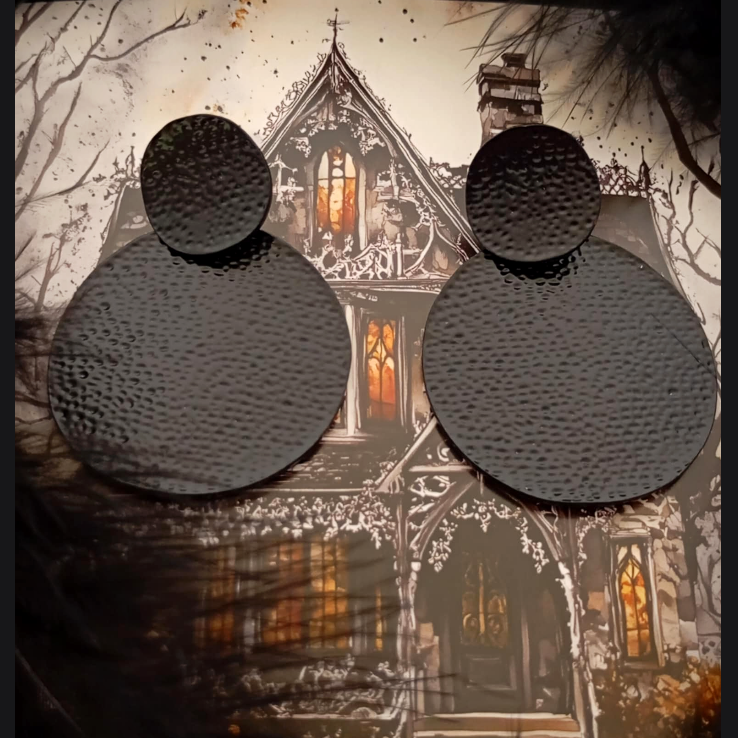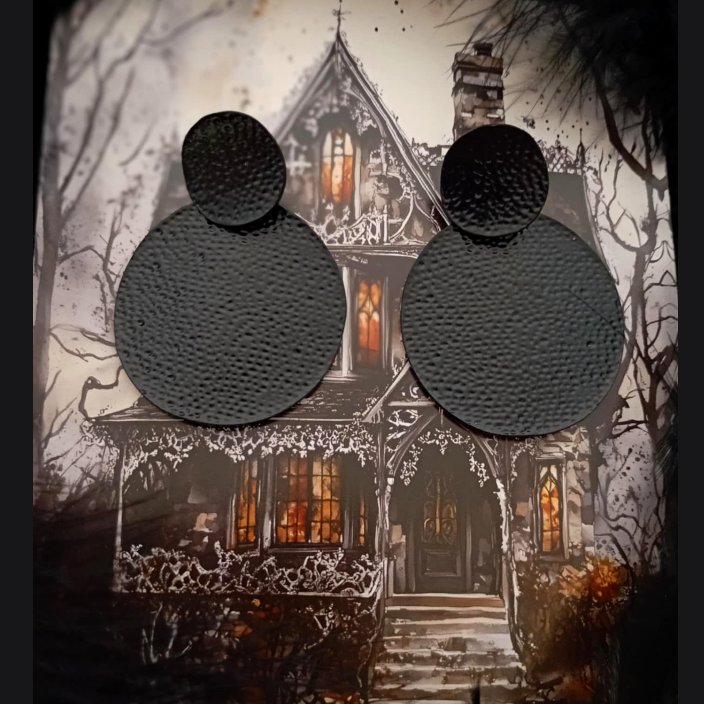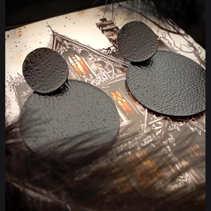 Minimal μαύρα σκουλαρίκια με ακανόνιστους δίσκους δύο μεγεθών, με ανάγλυφη επιφάνεια.