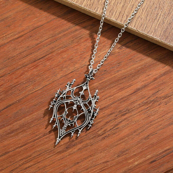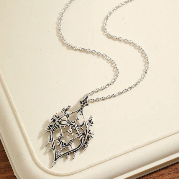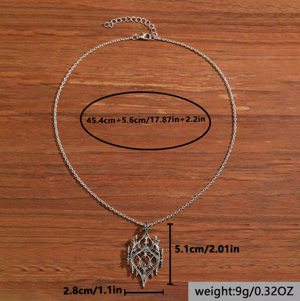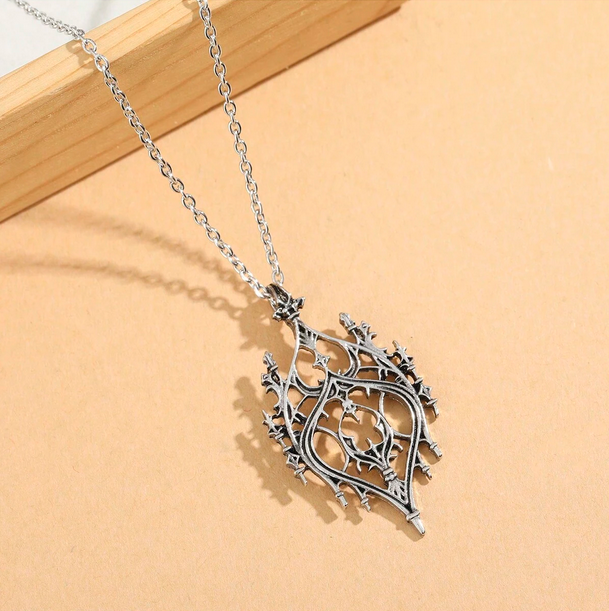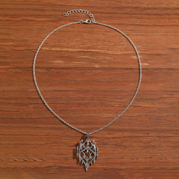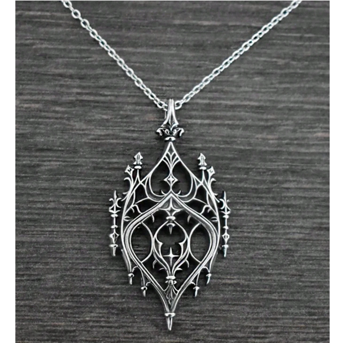Ιδιαίτερο vintage goth ασημί μενταγιόν με λεπτή αλυσίδα και διάτρητο charm που μοιάζει με gothic παράθυρο κάστρου.